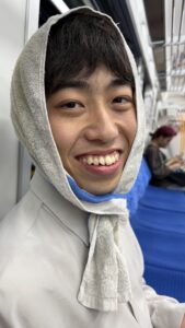 これは近所の銭湯に2人で行った帰りの電車の写真です。帰りに大雨が降ってタオルをかぶって雨をしのいだ時の様子です。